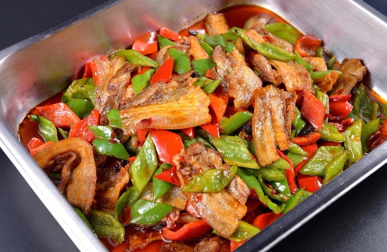 青椒回锅肉是一道传统的四川家常菜。是以青椒、猪肉(五花肉)、酱油、郫县豆瓣酱、糖、盐、葱段、姜片、蒜末为原材料制作而成。因为地域口味的不同,也是做法不一。做法简单,香气浓郁,肥而不腻。且具有提供血红素(有机铁)和促进铁吸收的半胱氨酸,能改善缺铁性贫血的功效。